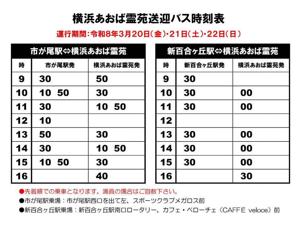 春のお彼岸に無料送迎バスを運行します。 日程:令和8